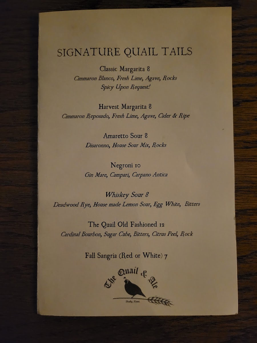 The drink menu is equally impressive, showcasing a range of draught beers from Miller High Life to Guinness Stout and expertly crafted cocktails such as the Quail Old Fashioned and Fall Sangria. With a friendly staff and a dedication to detail, The Quail & Ale promises a memorable dining experience that will keep you coming back.